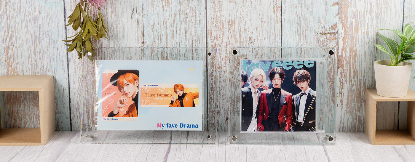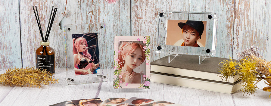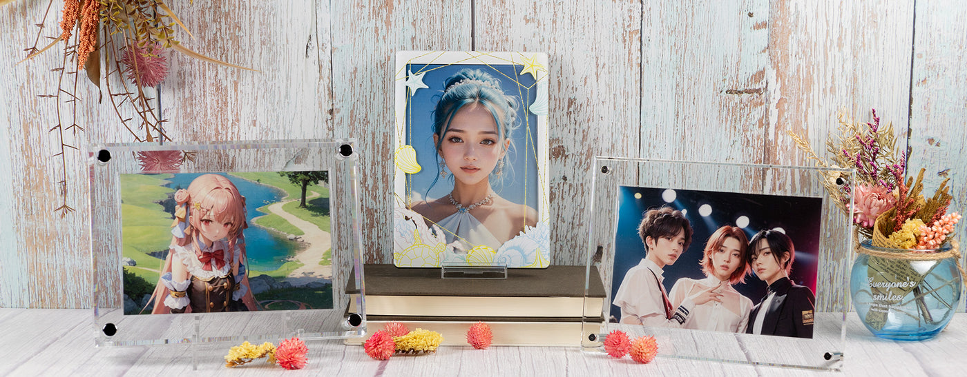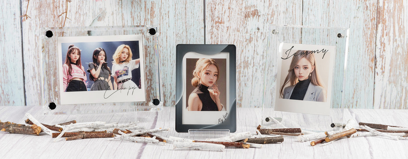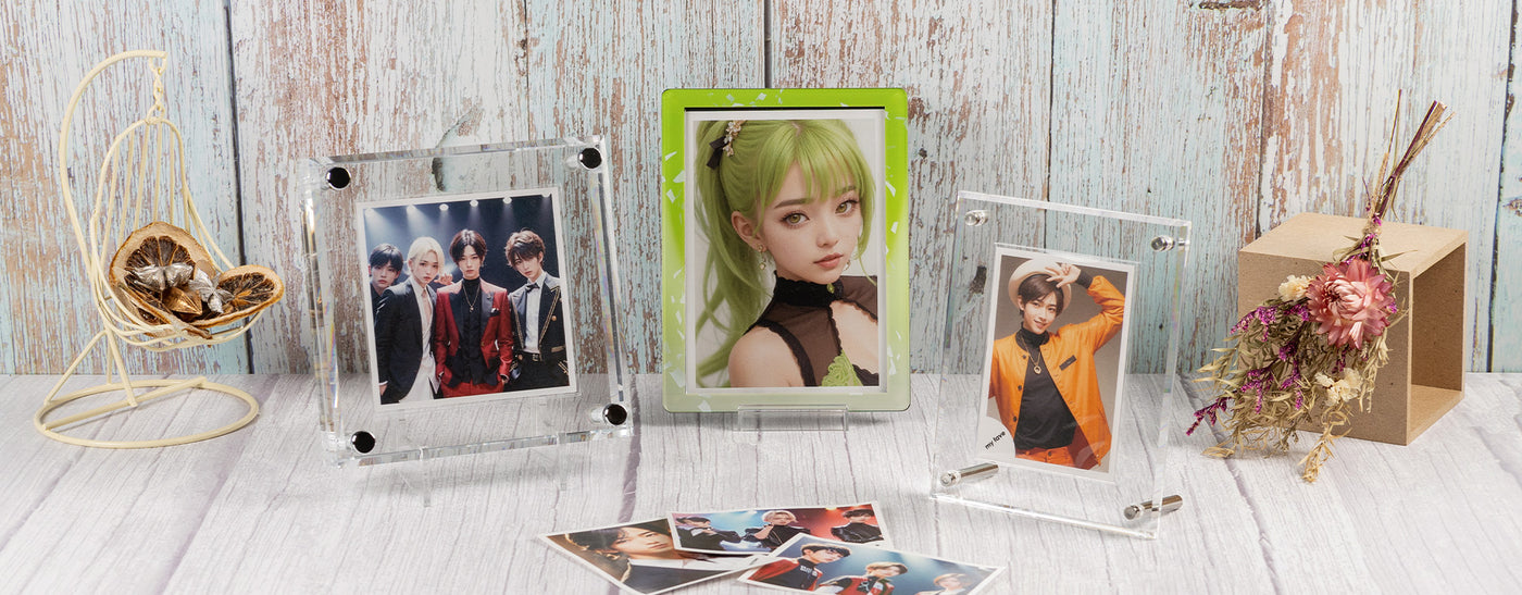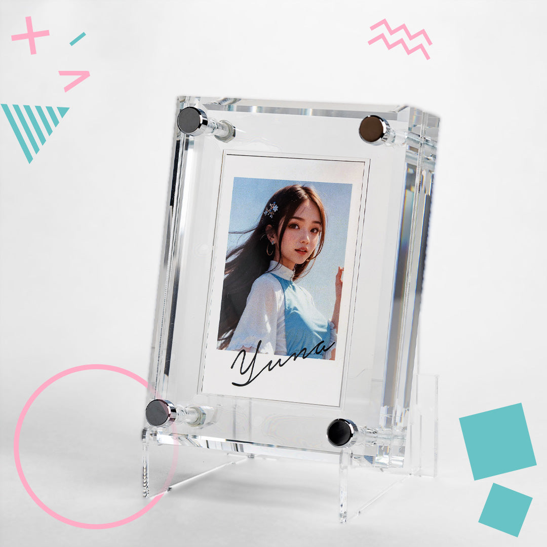 スキニースライドフレームは磁石式で手軽に使えるデザインフレームです。飾るものや推しカラーに合わせて選べるデザインとカラーバリエーションが豊富で、推しグッズがより映えて飾るのが楽しくなります。表面に UV カットアクリル、背面は黒いアクリルを使用しているので、紫外線対策も安心です。厚みが 6mmと薄く、スマートなデザイン設計で持ち運びにも便利です。