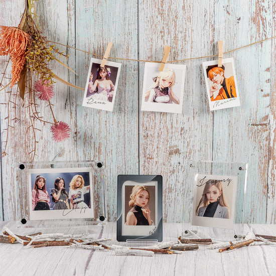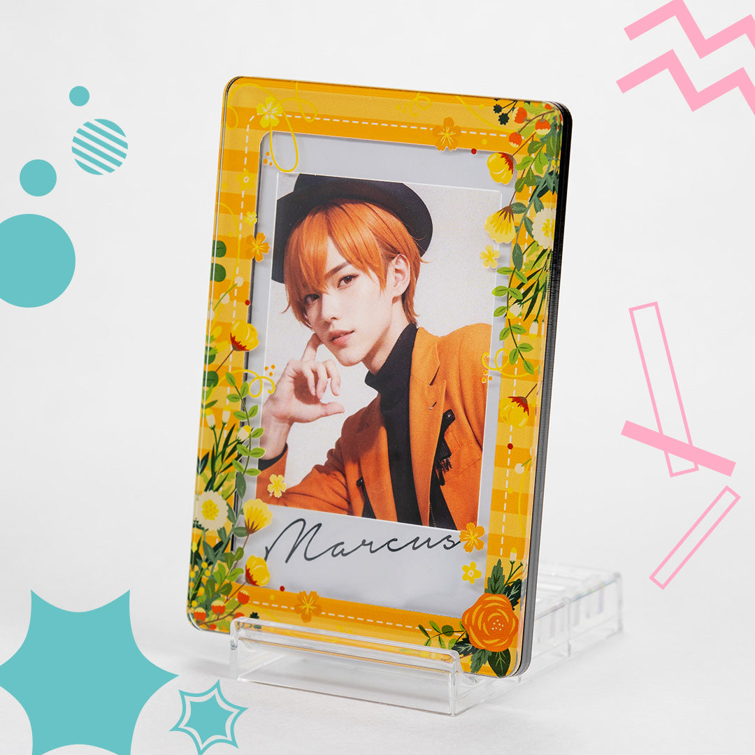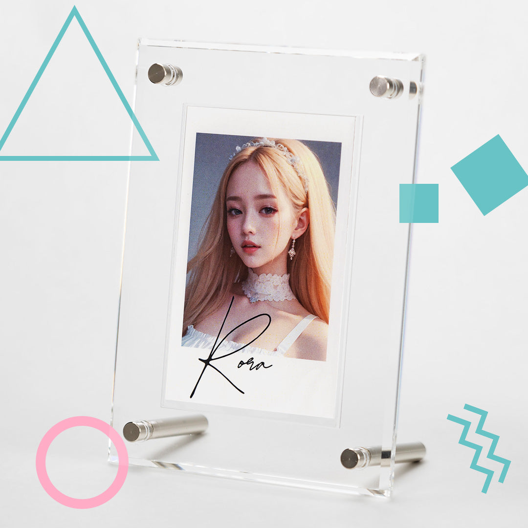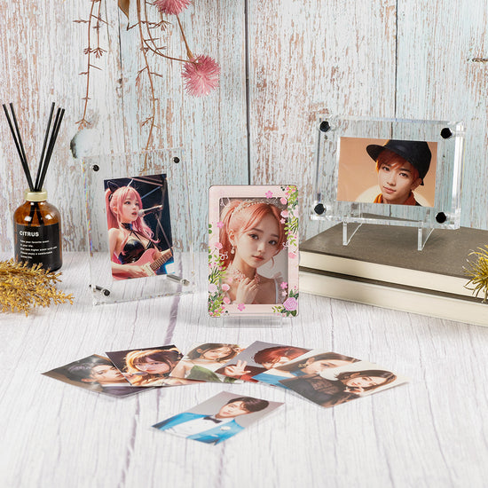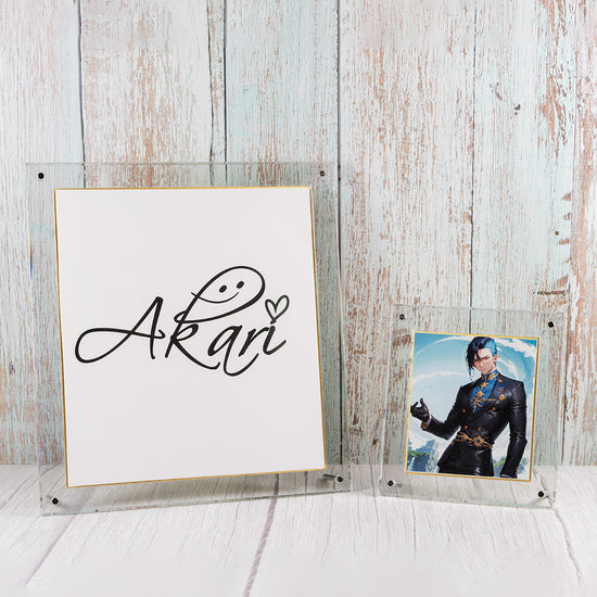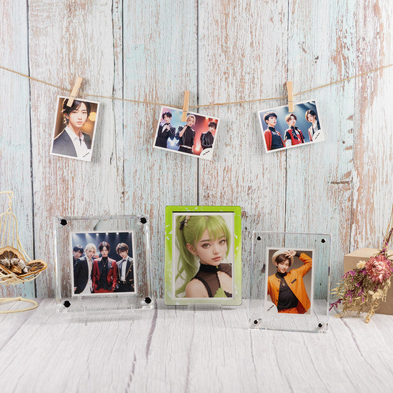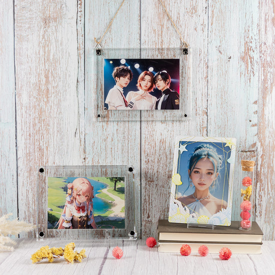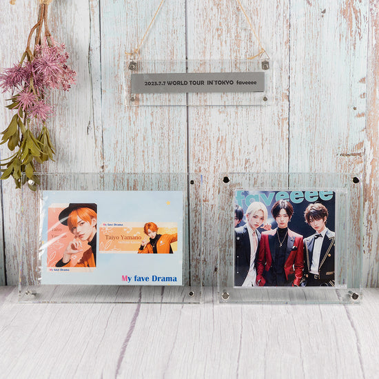 スキニースライドフレームは磁石式で手軽に使えるデザインフレームです。飾るものや推しカラーに合わせて選べるデザインとカラーバリエーションが豊富で、推しグッズがより映えて飾るのが楽しくなります。表面に UV カットアクリル、背面は黒いアクリルを使用しているので、紫外線対策も安心です。厚みが 6mmと薄く、スマートなデザイン設計で持ち運びにも便利です。